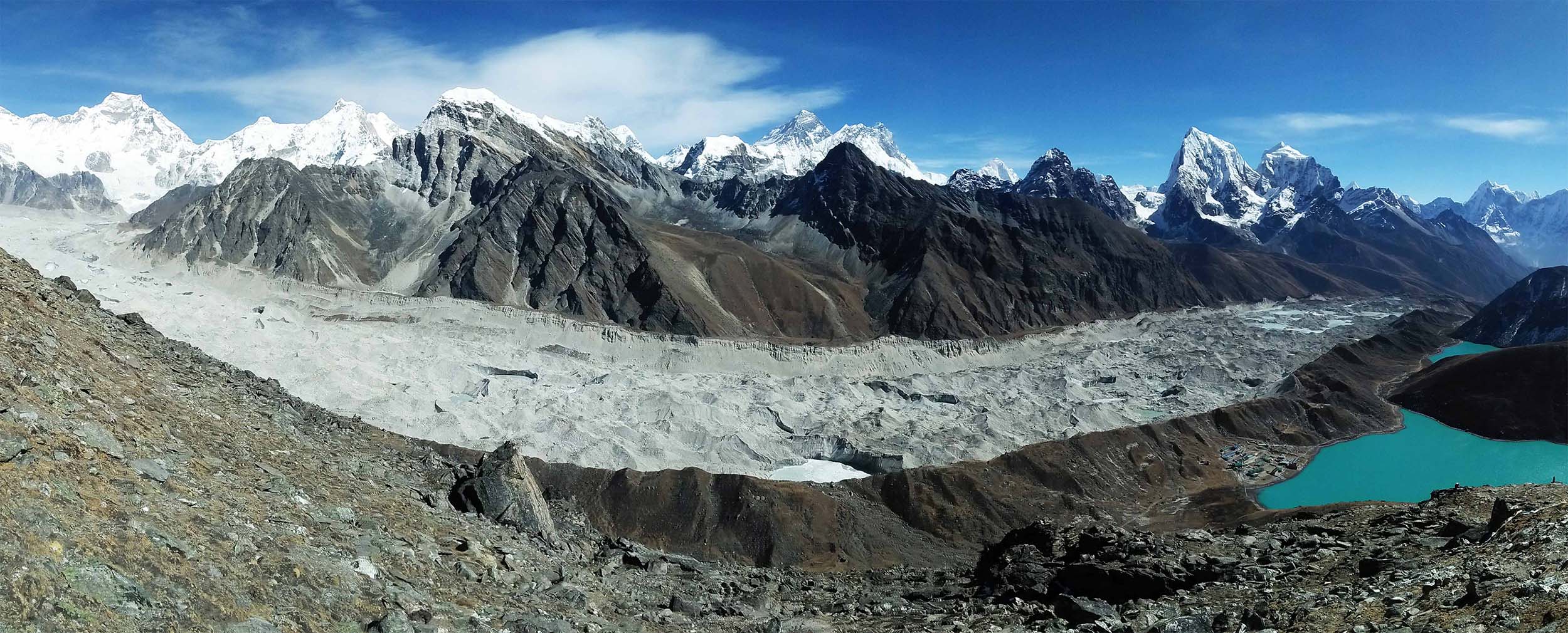 A panoramic view from Gokyo Ri showing Everest and the turquoise Gokyo lakes.