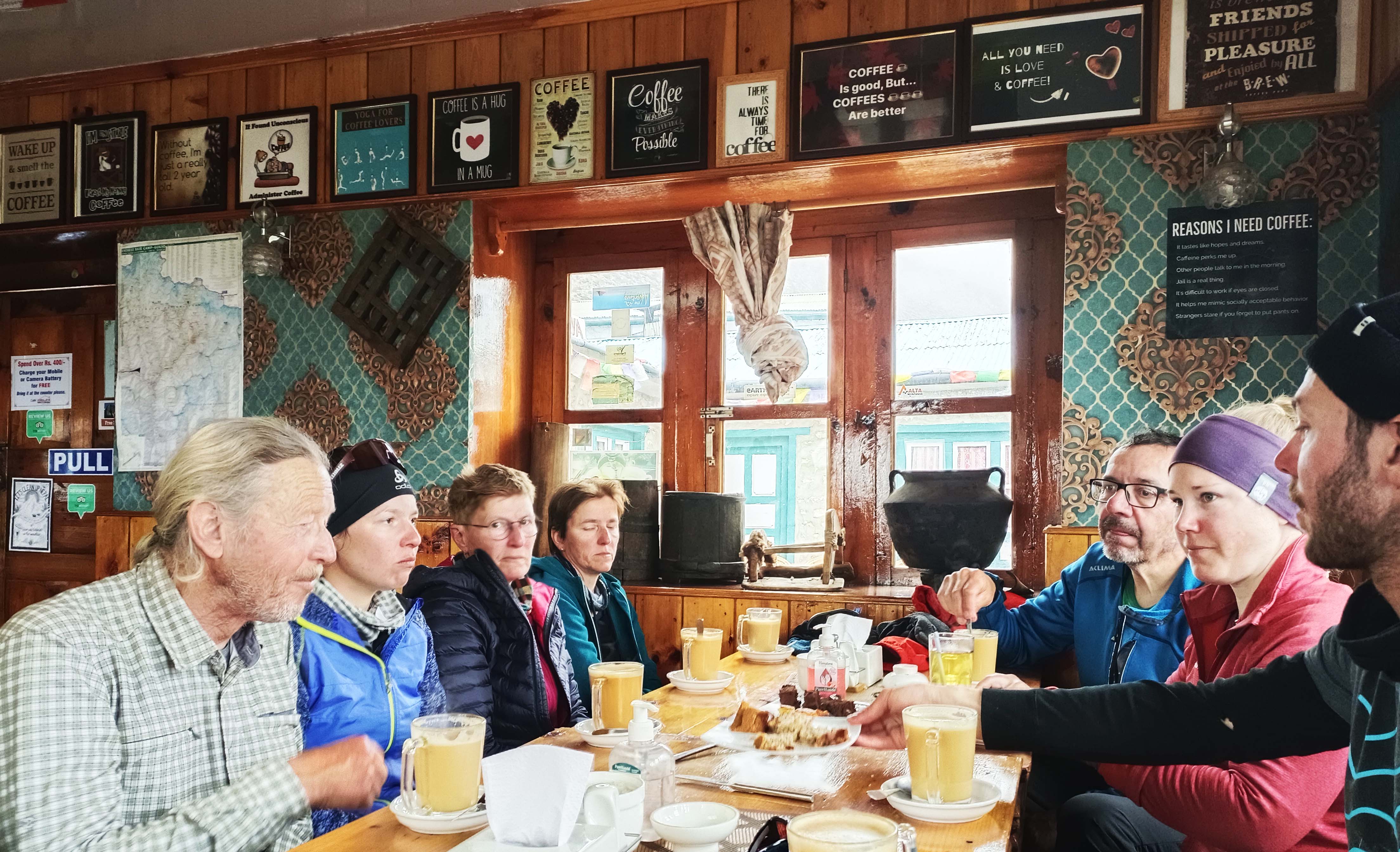 Having Dinner at a Typical teahouse dining room in the Everest Region.